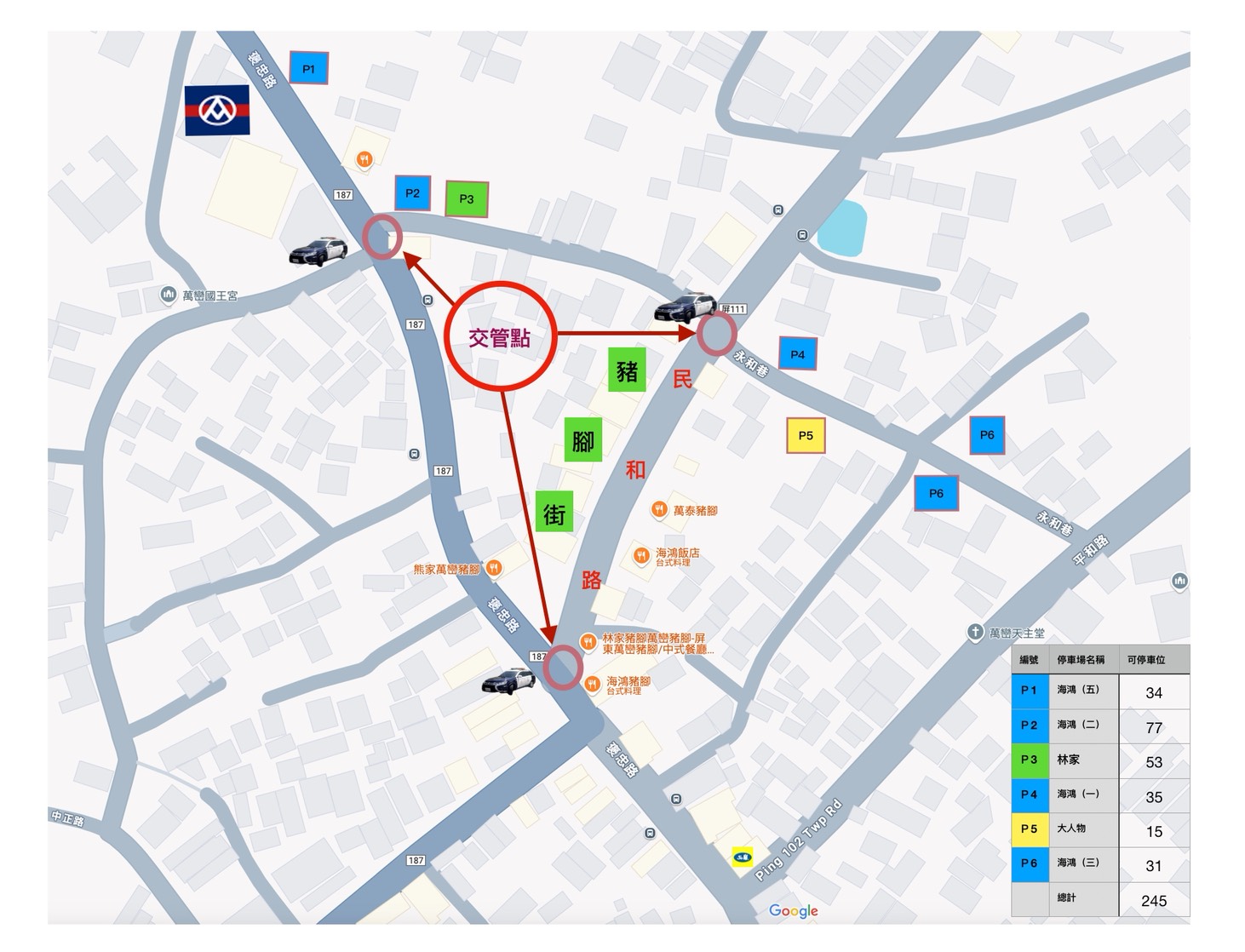 此外,萬巒市區道路狹窄,違規停車容易造成壅塞,尤其上午10時至下午2時用餐尖峰時段影響最為嚴重。警方提醒駕駛人,應將車輛停放於 褒忠路及永和巷6處停車場(約240個車位),再步行前往豬腳街。內埔警分局也將編排警力進行交通疏導,並 加強取締違規停車。